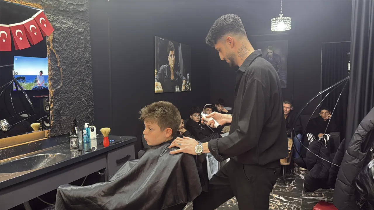 YALOVA’da berber Mehdi Kabak (25), gün boyu dükkanına gelen çocukları ücretsiz tıraş ederek 23 Nisan Ulusal Egemenlik ve Çocuk Bayramlarını kutladı.