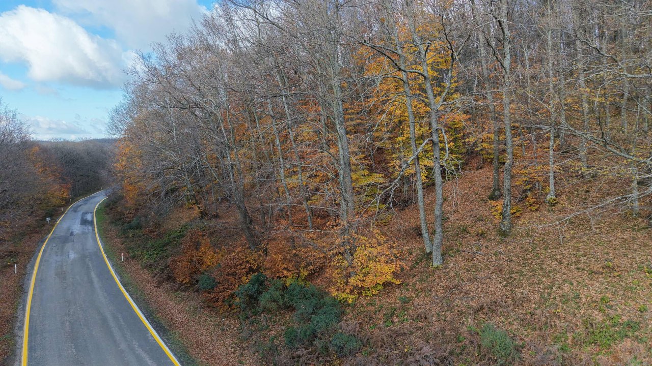 Çanakkale'nin Lapseki ilçesinin en yüksek yeri olan 650 rakımlı Dumanlı Dağı'ndaki ormanda renk cümbüşü yaşanıyor. Sonbaharın renklerine bürünen ağaçlarda, sarı ve grinin her tonun bulmak mümkün oluyor. Yağlı boya tabloyu andıran görsel şölen dronla görüntülendi. Dumanlı Dağı'ndaki manzara fotoğraf tutkunları için de doğal bir fon oluyor.