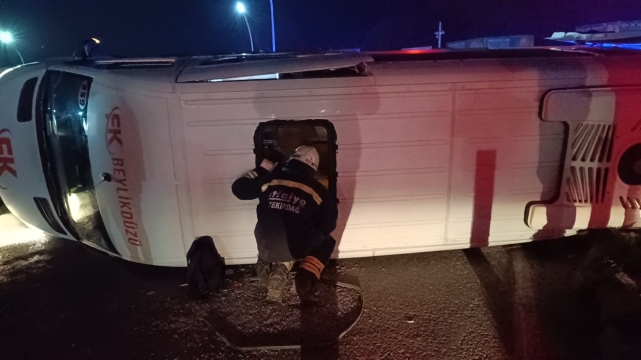 Ortalığın savaş alanına döndüğü kazada yolcu servisi yan yatarken, otomobil ise karşı yola savruldu.