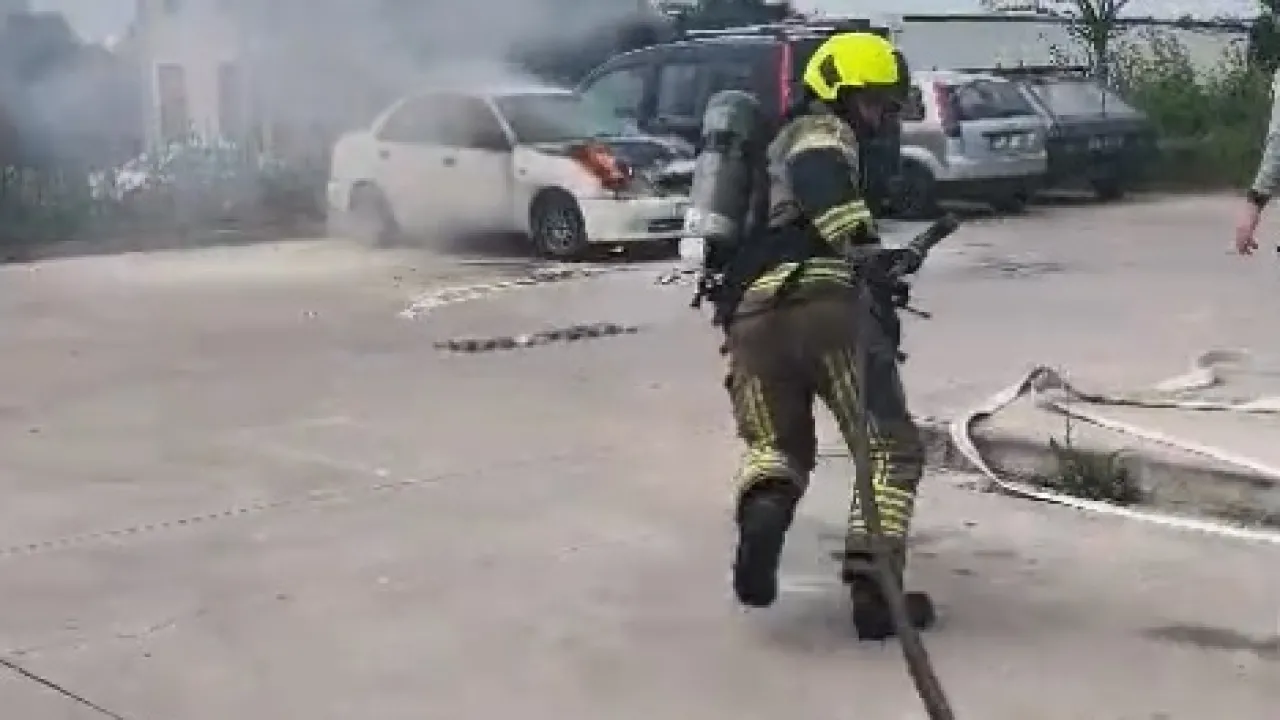 Karacabey Devlet Hastanesi’ne yakınını getiren Turgay Ç., 77 AAK 391 plakalı otomobilini saat 11.00 sıralarında otoparka park etti. Bir süre sonra aracın motor kısmından dumanlar yükselmeye başladı, ardından da alev aldı. Çevredekilerin ihbarı üzerine adrese itfaiye, polis ve sağlık ekipleri sevk edildi. Polis ekipleri yangın tüpüyle ilk müdahaleyi yaparken, kısa sürede gelen itfaiye ekipleri alevleri kontrol altına alarak söndürdü.