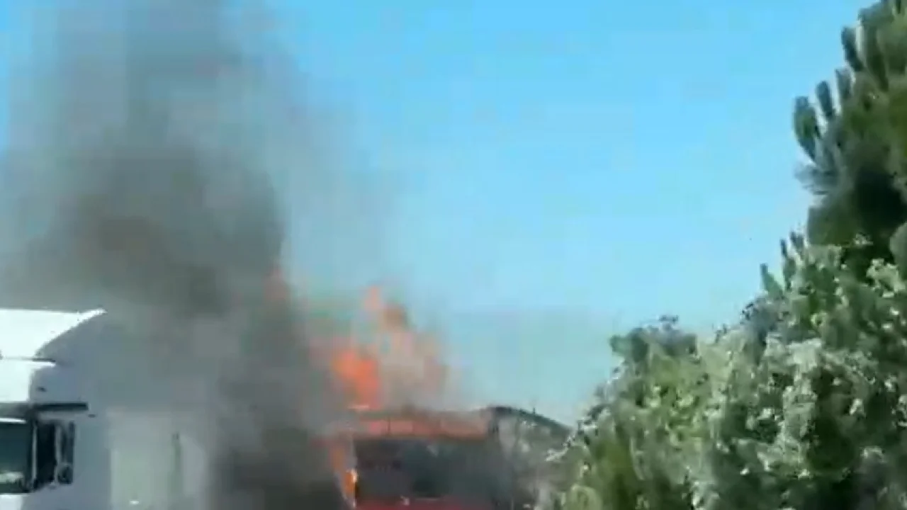 Bursa-İzmir kara yolunda seyir halinde olan, Mustafa G. (66) idaresindeki AEK 876 plakalı çekici ve 26 ABR 337 dorse plakalı karton yüklü TIR, saat 12.00 sıralarında Karacabey ilçesi Çatrak mevkiine geldiğinde alev aldı. Sürücü, TIR’ı sağ şeride çekti. İhbarla olay yerine itfaiye ekipleri sevk edildi. Yol ulaşıma kapanırken, dorsedeki yangın, ekiplerin 1 saatlik çalışması sonucu kontrol altına alındı. Yangın, cep telefonu kamerası ile görüntülendi.