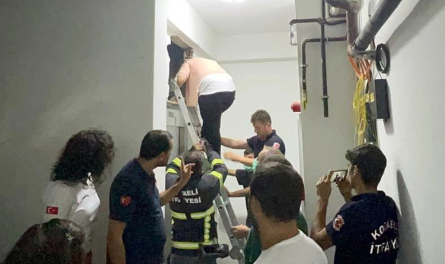 Bunun üzerine itfaiye ekibi, balyoz ve hilti yardımıyla asansör kapısının üzerindeki duvarı kırdı.