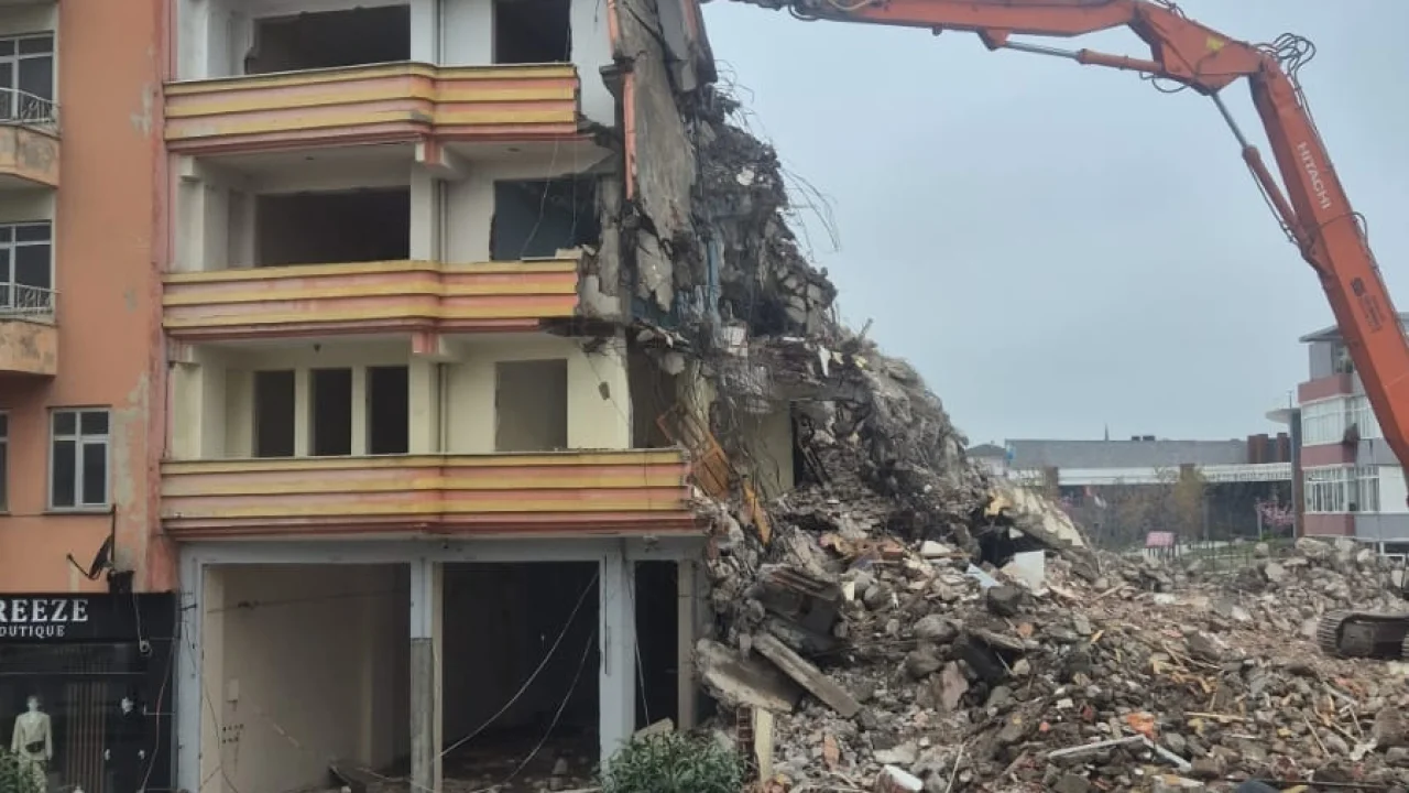 SAKARYA'nın Karasu ilçesinde 6 katlı bina, yıkım sırasında iş makinesinin üzerine devrildi. İş makinesi hasar görürken, o anlar cep telefonu kamerasıyla görüntülendi.